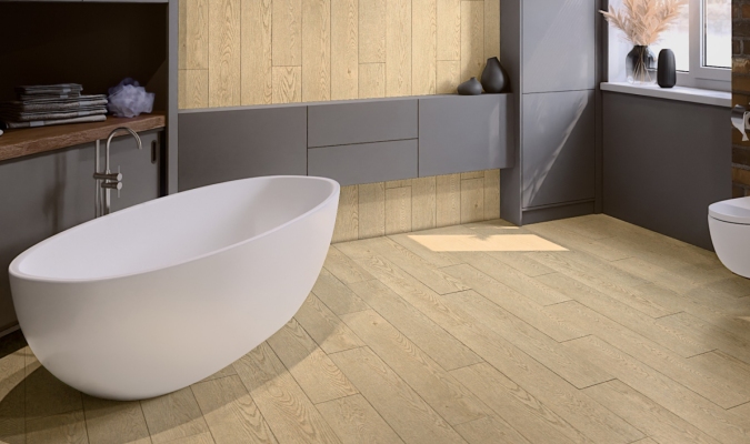 Усовершенствованная LVT плитка не впитывает и не пропускает влагу. Покрытие подходит для укладки в зонах с повышенной влажностью - ванной и кухне.