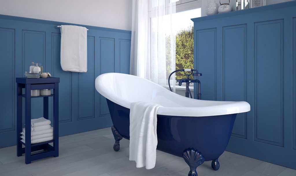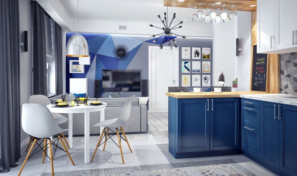 Светло-голубой создаёт ощущение лёгкости, а ярко-синий можно использовать в качестве акцентов или в качестве цвета мебели.