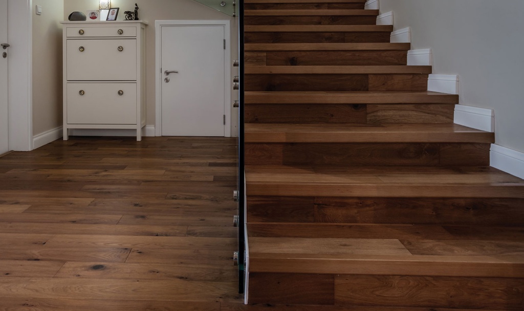 Классическое деревянное покрытие на лестничные ступени всегда выглядит благородно. Оно тёплое на ощупь, создаёт уют и подходит для большинства интерьеров. Однако натуральное дерево требует ухода: его нужно периодически лакировать и защищать от влаги.